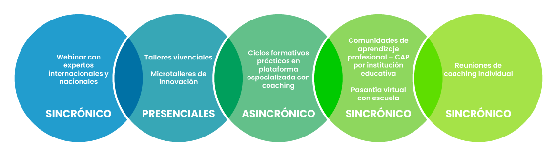 (encuentros, seminarios, talleres presenciales, sincrónicos, trabajo autónomo en plataforma, microtalleres con coach, reuniones individuales con coach y comunidades de aprendizaje)